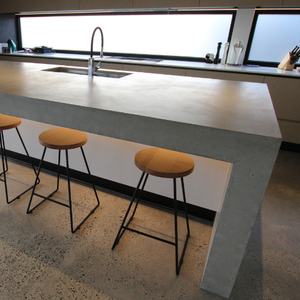 Concrete has increased in popularity over the last few years with the industrial trend increasing. As these are handmade there are no two that are alike. They are extremely hard-wearing and can have sinks and vanities made as part of the bench. The weight is similar to natural stone and hot items can also be placed on them. Concrete is mostly pre-cast off-site and delivered to the site as a finished product, to maintain control. However, more creative kitchen design ideas can be poured on-site.